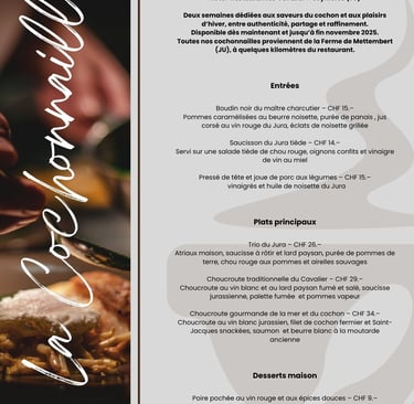 Toutes nos cochonnailles proviennent de la Ferme de Mettembert (JU), à quelques kilomètres du restaurant.