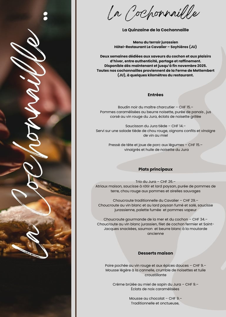 Lorsque l’automne habille nos forêts de ses plus belles couleurs, la table du Cavalier se transforme en un hommage aux saveurs de la chasse et du terroir jurassien.