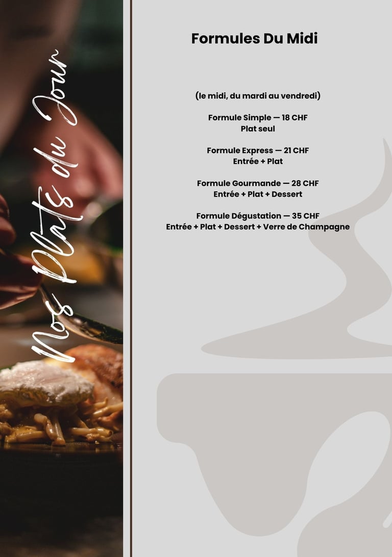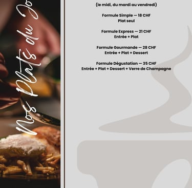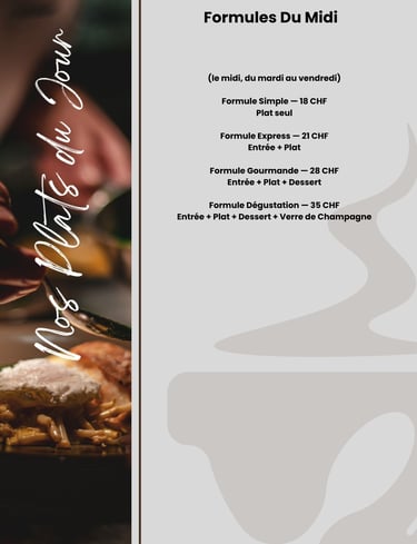 Du mardi au vendredi midi, notre chef vous propose des formules gourmandes et accessibles, idéales pour une pause savoureuse et conviviale.