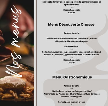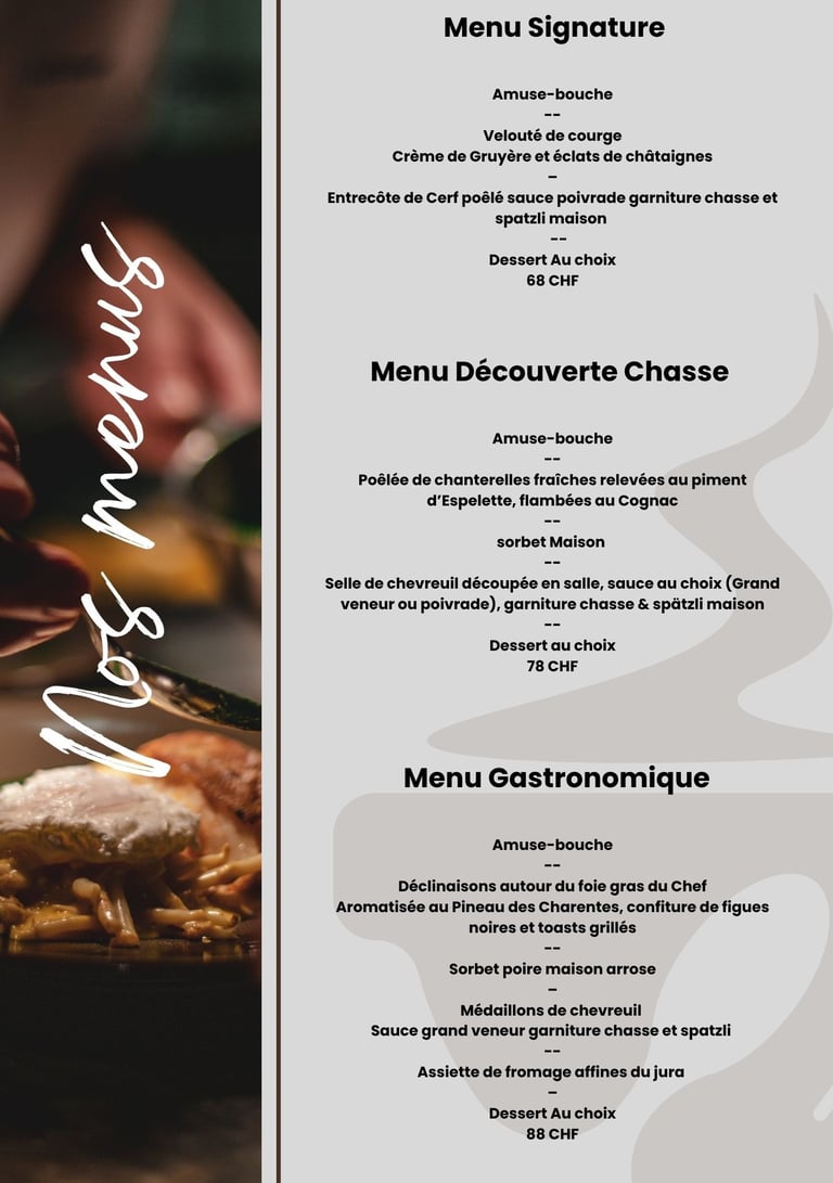 Nos menus sont conçus comme une véritable balade gourmande, mêlant traditions et créativité : de l’amuse-bouche raffiné aux pièces nobles de gibier découpées en salle, chaque étape est pensée pour éveiller les sens et prolonger l’expérience conviviale autour d’une cuisine authentique.